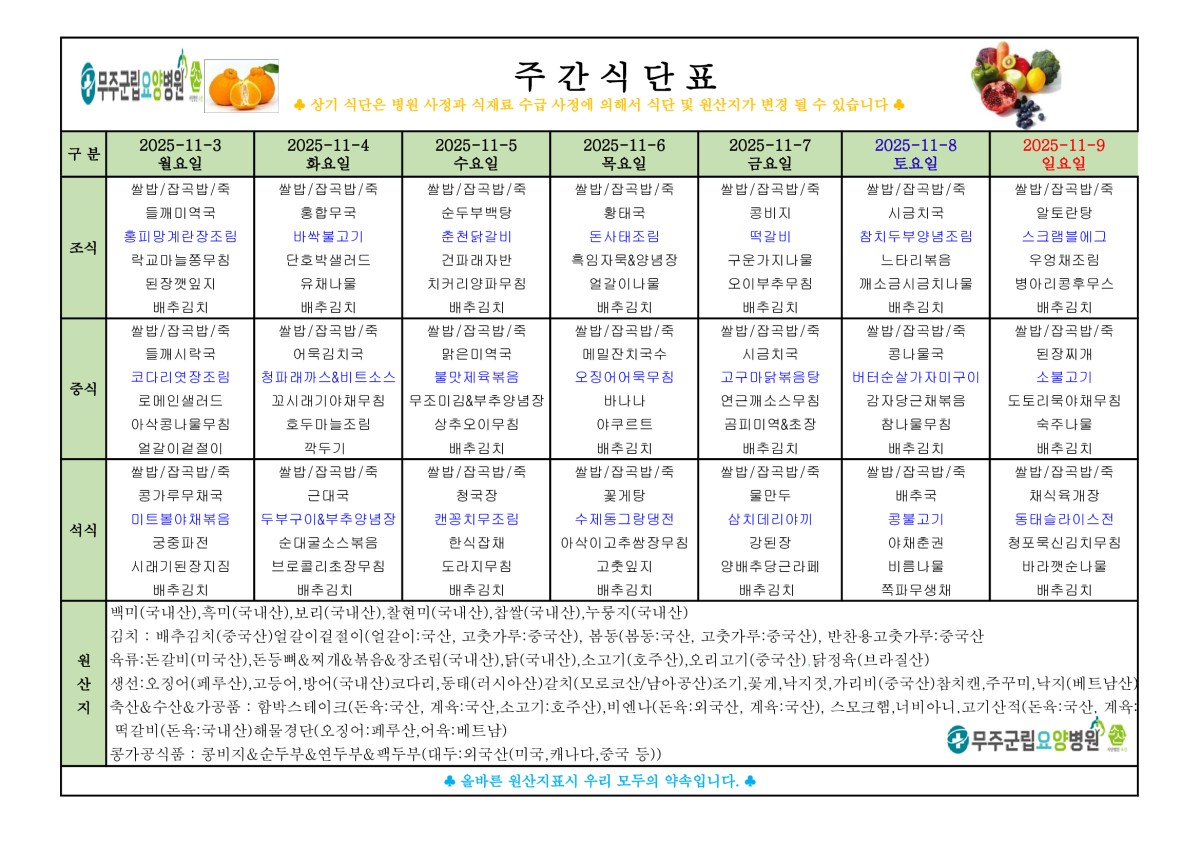 2025년 11월 첫째주 주간식단표