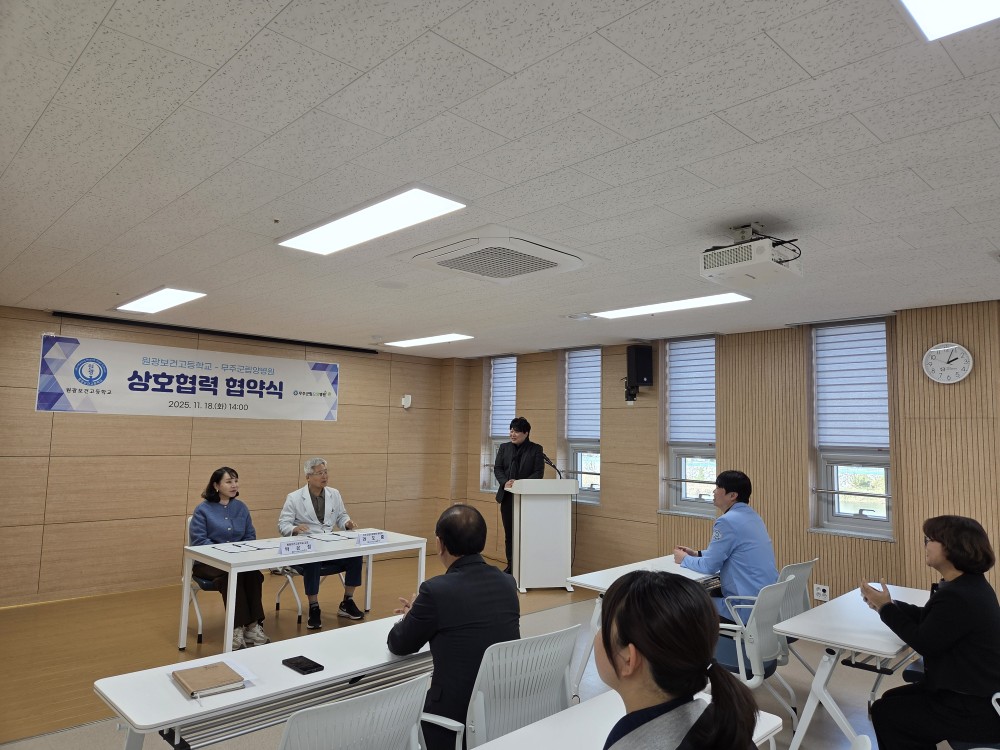 2025년 11월 18일 14시에 원광보건고등학교와 무주군립요양병원의 상호협력 협약식이 진행되었습니다.